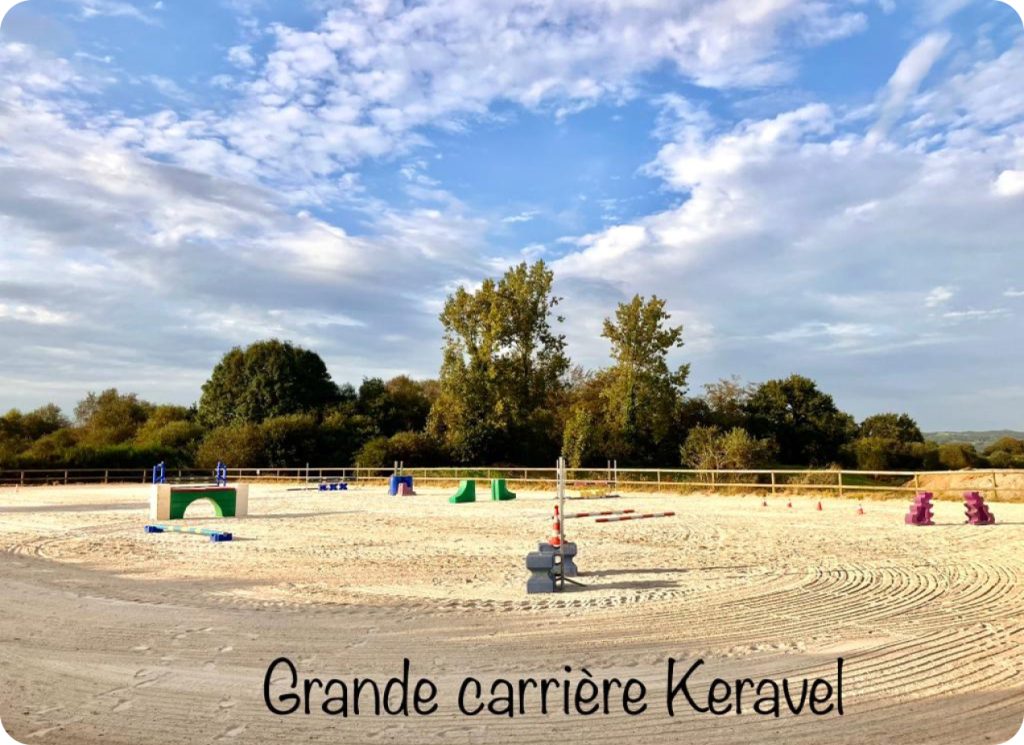 Carrière technique d’une surface de 20 x 40 m, surélevée en hauteur et entièrement drainée en intérieure (en épis) et extérieure (drains et fossés), cette carrière est le fruit d’une longue réflexion, permettant à celle-ci d’être praticable toute l’année malgré le temps particulier de notre région. Pas moins de 6 couches de matériaux différents ont été nécessaire à sa réalisation. En sable blanc type sable de Fontainebleau mais mieux adapté à notre région.