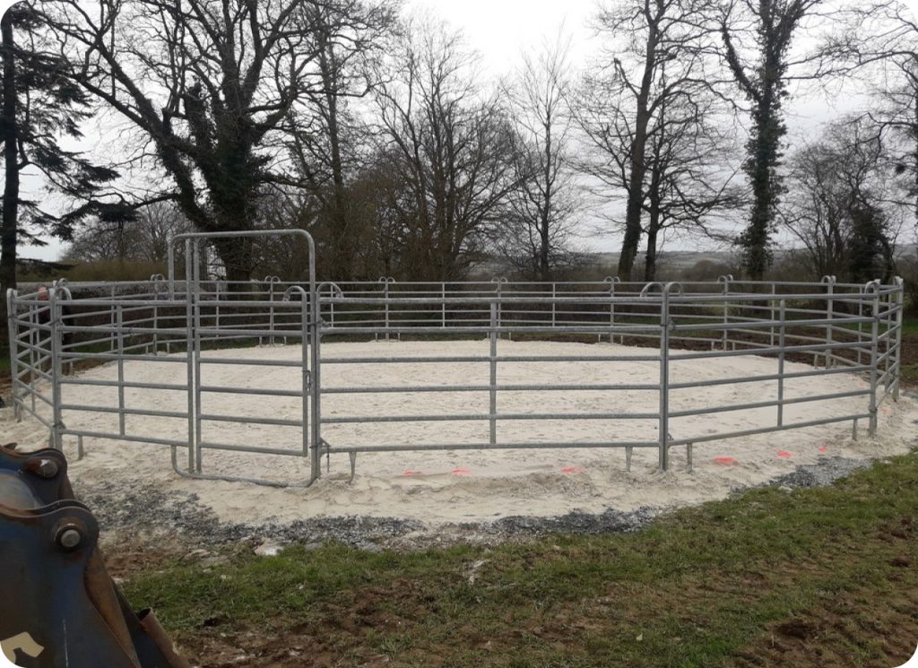 Rond de longe de 15 m de diamètre, entièrement fermé avec des barrières hautes Texas en galva. Surface idéale pour le travail du jeune cheval, pour longer les chevaux dans un espace sécurisé. Le rond de longe est désormais couvert.